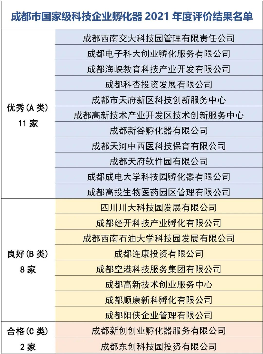 近日,科技部下發《科技部火炬中心關于公布國家級科技企業孵化器2021年度評價結果的通知》,成都市包括成都西南交大科技園管理有限責任公司等在內的11家國家級科技企業孵化器考評結果為優秀(A類),獲評優秀的國家級科技企業孵化器數量占四川省獲評優秀總數達65%;全市21家國家級科技企業孵化器(2021年)有19家考評結果為優秀、良好,國家級科技企業孵化器年度評價優良率超過90%。
